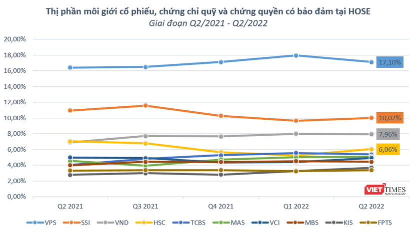 Thống kê mới nhất của HoSE cho thấy, CTCP Chứng khoán VPS (VPS) vẫn giữ vững ngôi đầu về thị phần môi giới cổ phiếu, chứng chỉ quỹ và chứng quyền có bảo đảm, chiếm 17,1% thị phần, giảm nhẹ so với mức 17,94% trong quý 1/2022.