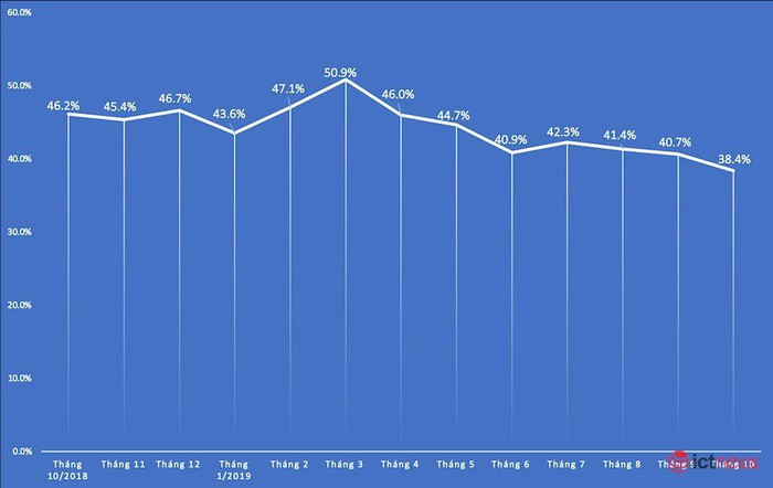 Báo cáo của GfK cho thấy trong tháng 10/2019, thị phần smartphone của Samsung tại Việt Nam đạt 38,4%, thấp nhất trong vòng 1 năm trở lại đây.