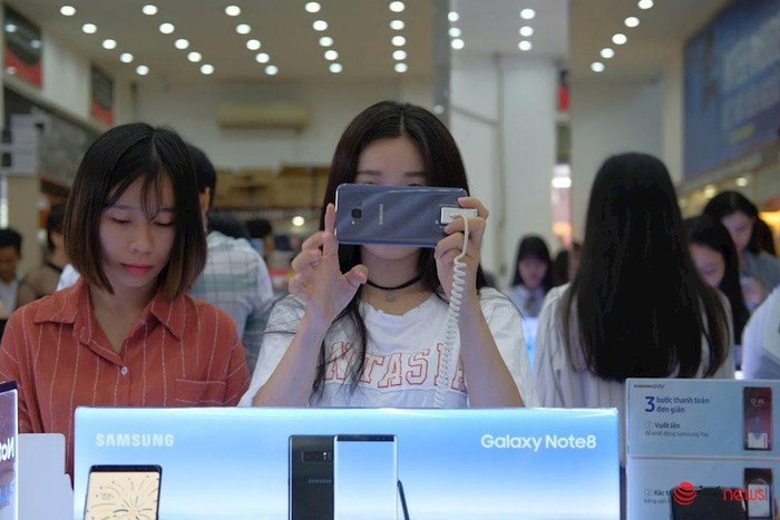 Một khách hàng đang thử dùng điện thoại Samsung Galaxy Note 8 tại siêu thị. Ảnh: Hải Đ