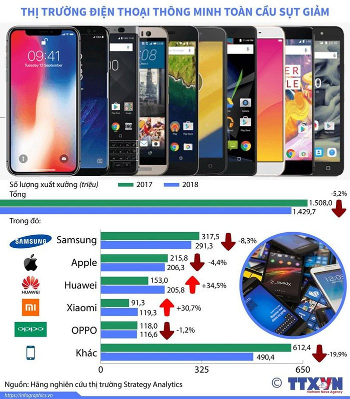 Số lượng điện thoại thông minh được xuất xưởng trên toàn cầu trong năm 2018 đã sụt giảm lần đầu tiên.