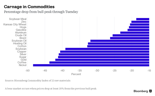8 trong số 22 hàng hóa thuộc Chỉ số hàng hóa của Bloomberg giảm ít nhất 20% từ mức đỉnh thiết lập gần đây, hay nói cách khác là rơi vào thị trường giá xuống. Trong đó, đáng chú ý là giá dầu thô và giá vàng. Bốn hàng hóa gồm ngô, khí tự nhiên, lúa mỳ và gia súc chật vật để thoát khỏi thị trường giá xuống do vấn đề thời tiết và nguồn cung.