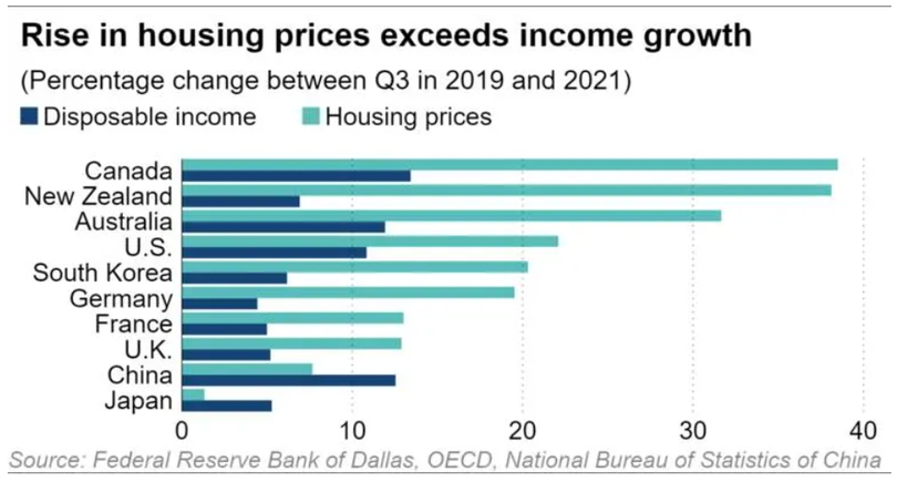 Số liệu của Ngân hàng chi nhánh Dallas của Fed cho thấy, giá nhà ở 25 quốc gia, bao gồm: Úc, New Zealand và Mỹ đã nhảy vọt sau khi Covid bùng phát. Theo đó, các quốc gia trên ghi nhận mức giá trong giai đoạn từ tháng 7 đến tháng 9/2021 tăng 13% so với cùng kỳ năm trước. Tỷ lệ tăng của giá nhà cũng đã vượt mức tăng của thu nhập khả dụng ở 22 quốc gia.