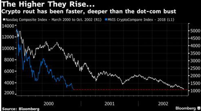 Cũng giống như các nhà đầu tư trong thời kỳ cổ phiếu công nghệ tăng giá chóng mặt cách đây 2 thập niên, các nhà đầu đặt cược lớn vào blockchain – công nghệ có vẻ mang tính cách mạng – đang gánh chịu thiệt hại lớn, đặc biệt là những người rót vốn vào một số đồng tiền mật mã ít tên tuổi.