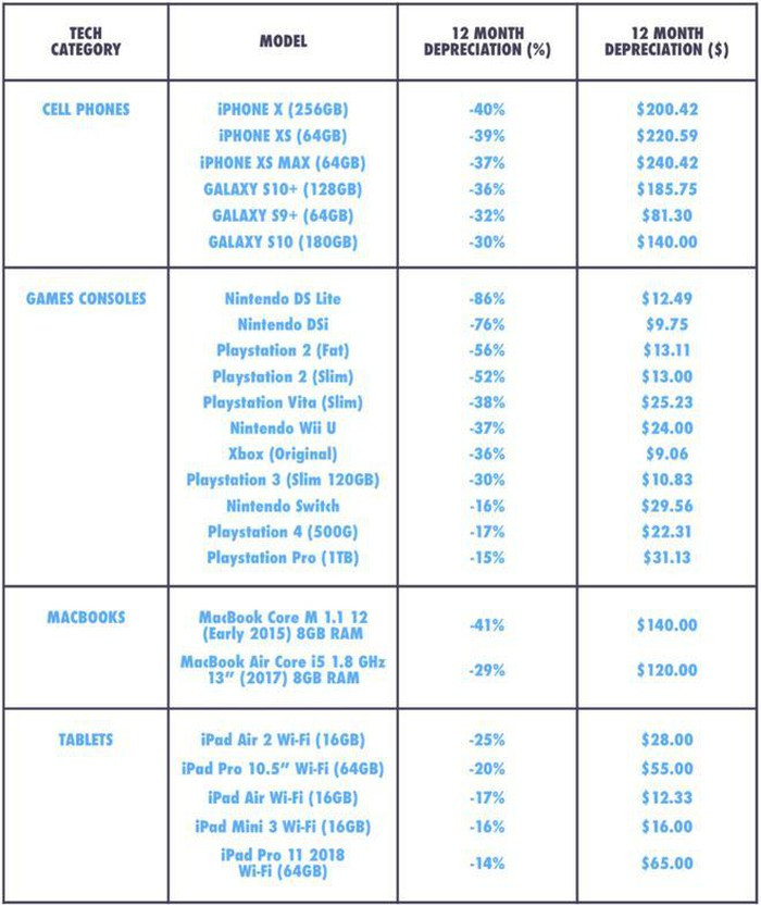Theo thống kê, trung bình mỗi năm, các món đồ công nghệ cũ như điện thoại, máy tính bàn, máy tính bảng, máy chơi game và thiết bị đeo giảm 26% giá trị so với giá niêm yết.