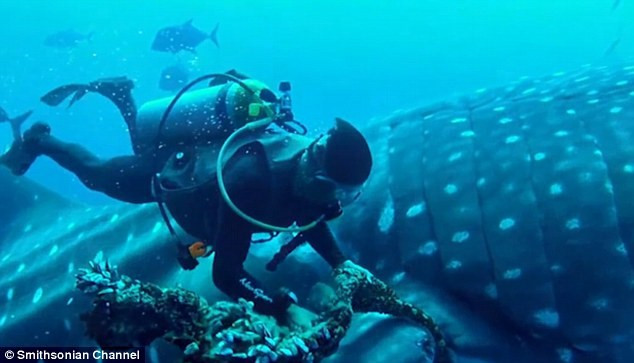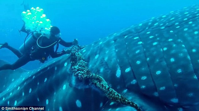 Nhóm thợ lặn mạo hiểm cắt dây cuốn quanh một con cá mập voi ở ngoài khơi đảo Socorro, Mexico.