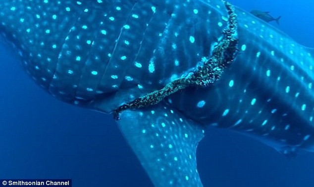 Chiếc dây thiết chặt vào cơ thể khiến cá mập voi bị thương.