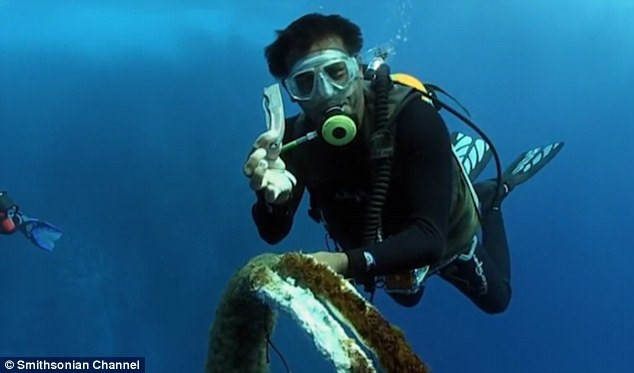 Thợ lặn cầm sợi dây vừa được cắt khỏi cơ thể cá mập voi.