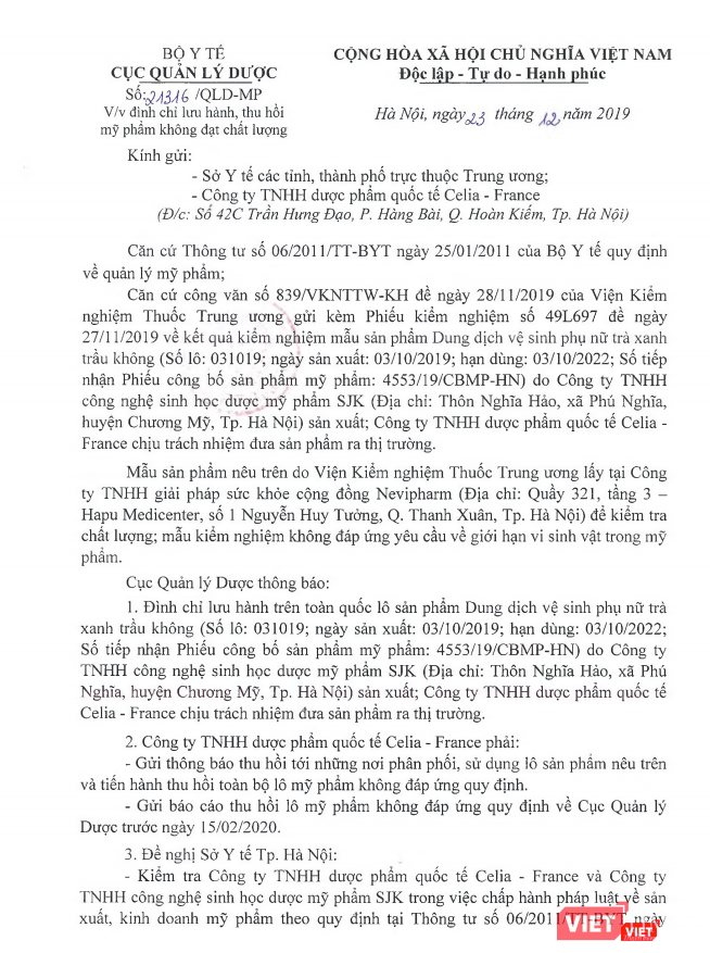 Vì thế, Cục Quản lý Dược thông báo đình chỉ lưu hành toàn quốc lô sản phẩm dung dịch vệ sinh phụ nữ trà xanh trầu không do Công ty TNHH Công Nghệ Sinh Học Dược Mỹ Phẩm SJK (địa chỉ: Thôn Nghĩa Hảo, xã Phú Nghĩa, huyện Chương Mỹ, TP. Hà Nội) sản xuất, Công ty TNHH Dược Phẩm Quốc Tế Celia – France chịu trách nhiệm đưa sản phẩm ra thị trường.