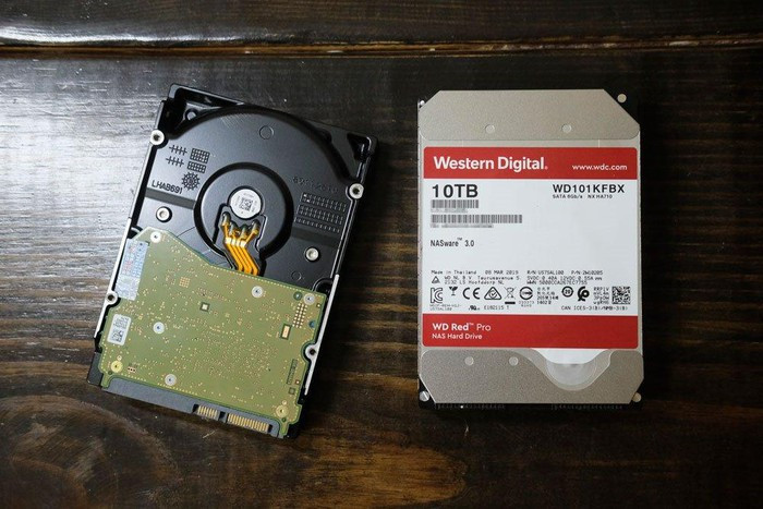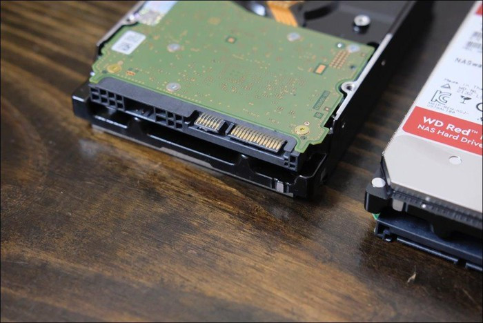 Ổ đĩa có tốc độ chuẩn kết nối 6Gb/s, tích hợp NASware 3.0, dung lượng 10TB và dòng chữ WD Red Pro NAS Hard Drive. Lật để xem thử mặt dưới ta có thể quan sát được bề mặt của đĩa khá sạch sẽ với các mạch in PCB. Ở cạnh ở đĩa có kết nối SATA và nguồn.