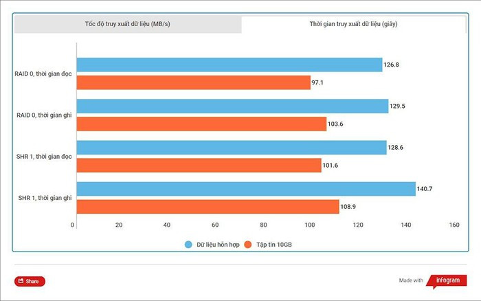 Cũng với phép thử trên, chúng tôi nhận thấy tốc độ truy xuất dữ liệu của Red Pro 10TB giảm đôi chút so với chạy RAID 0. Trong đó tác vụ ghi dữ liệu hỗn hợp giảm nhiều nhất là 8,1% và ít nhất là tác vụ đọc dữ liệu hỗn chỉ 1,4%. Tham khảo chi tiết trong biểu đồ kết quả bên dưới.