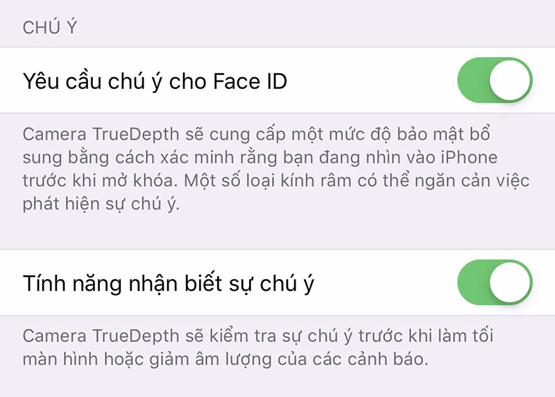 Kéo xuống tìm đến mục Chú ý, tắt tùy chọn Yêu cầu sự chú ý cho Face ID.
