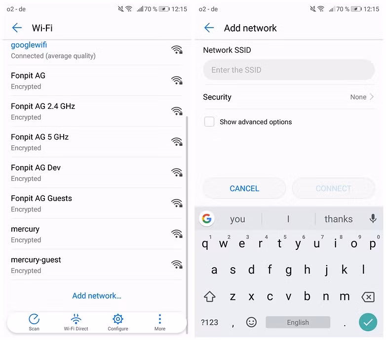 Nếu sự cố liên quan đến mạng ẩn, bạn có thể khắc phục theo cách thủ công. Mở Settings > Wi-Fi > Add network. Nhập SSID và mật khẩu chính xác, và bạn có thể tiếp tục thoải mái lướt web và trang mạng xã hội.