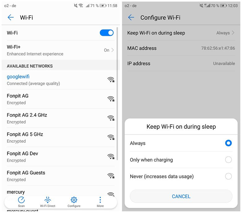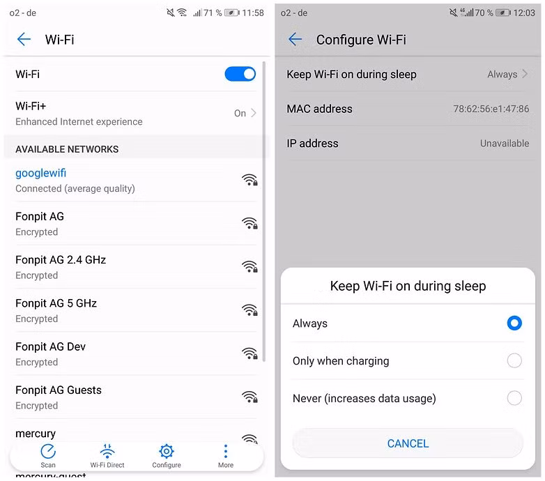 Rất có thể bạn chưa bật tùy chọn "Keep Wi-Fi on during sleep". Cài đặt này sẽ tự động ngắt kết nối thiết bị của bạn khỏi mạng Wi-Fi để tiết kiệm pin.