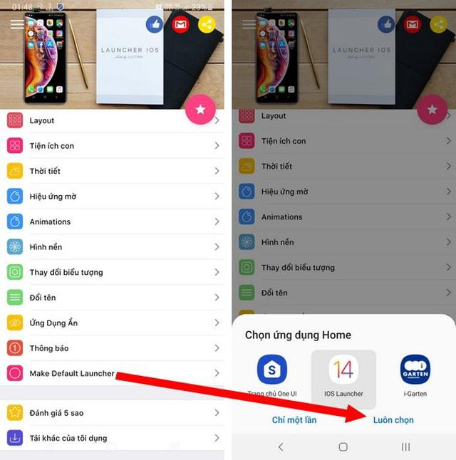 Từ giao diện thiết lập của ứng dụng, bạn chọn "Make Default Launcher", sau đó chọn "iOS Launcher" từ hộp thoại hiện ra và nhấn nút "Luôn chọn". Như vậy, bạn đã sử dụng Launcher iOS 14 làm giao diện mặc định trên smartphone.