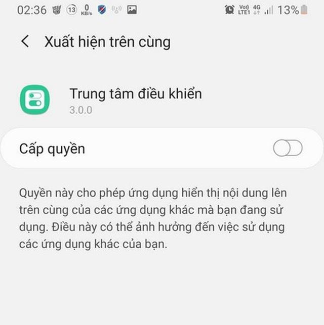 Sau khi cài đặt, trong lần đầu kích hoạt ứng dụng, một hộp thoại hiện ra để xin cấp quyền, cho phép Control Center có thể hiển thị trên màn hình smartphone. Bạn nhấn nút "Cấp quyền" tại giao diện hiện ra này.