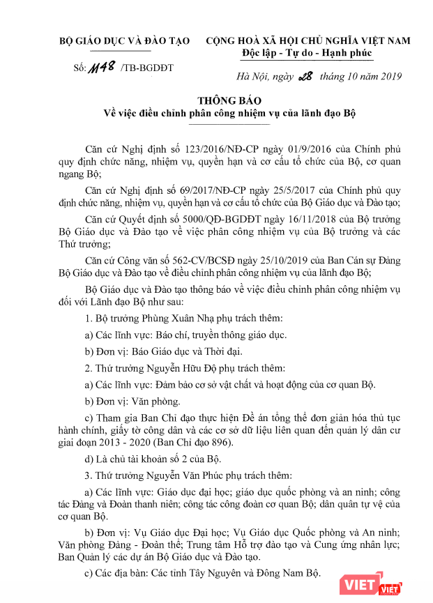 Cũng theo thông báo của Bộ GD&ĐT, Bộ trưởng Bộ GD&ĐT Phùng Xuân Nhạ sẽ phụ trách thêm các lĩnh vực báo chí, truyền thông giáo dục, Báo Giáo dục và Thời đại.