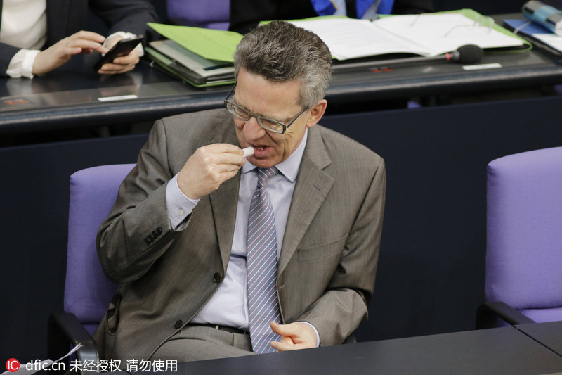 Ngày 9/4/2014, tại Berlin (Đức), Bộ trưởng Bộ nội vụ Đức Ulrich de Maizière lén thoa son dưỡng trong cuộc hội nghị bàn về vấn đề dự toán ngân sách.
