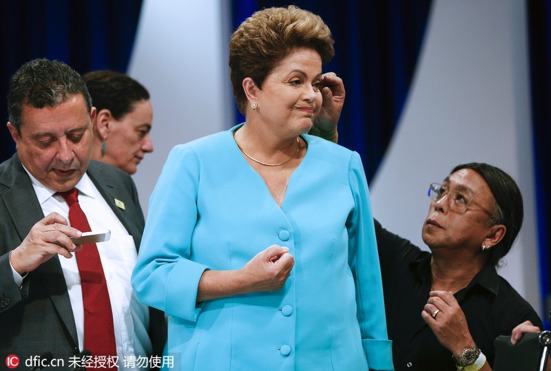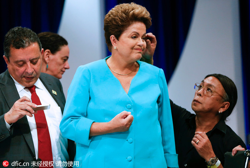 Ngày 16/20/2014, tại Sao Paolo (Brazil), hai ứng cử viên tranh cử tổng thống là đương kim tổng thống Dilma Rousseff và ứng viên của Đảng xã hội dân chủ AécioNeves tham gia cuộc biện luận trên truyền hình. Vòng bỏ phiếu thứ hai của cuộc bầu cử tổng thống ở Brazil diễn ra vào ngày 26/10. Trong ảnh, kim tổng thống Dilma Rousseff trang điểm trước khi vào vòng biện luận.