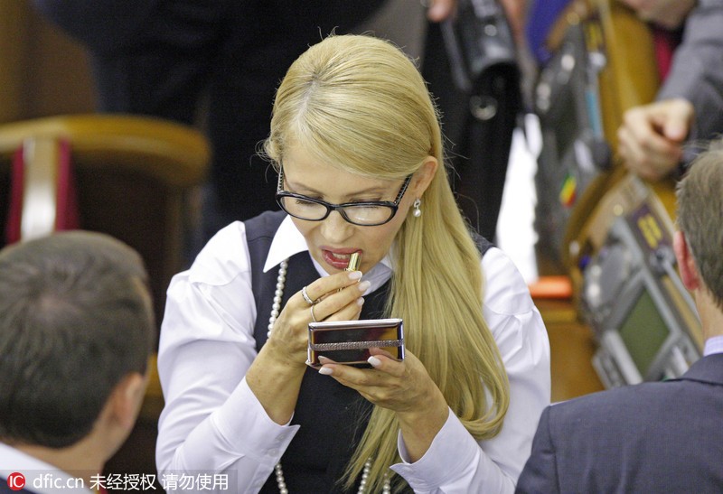 Ngày 16/2/2016, tại Kiev (Ukraina), cựu thủ tướng Ukraina Tymoshenko tranh thủ chỉnh sửa son môi trước cuộc hội nghị của quốc hội nước này.