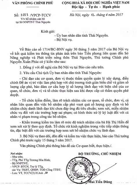 Đồng thời, tỉnh Thái Nguyên còn phải xem xét, miễn nhiệm chức vụ đối với các trường hợp sai phạm; có hình thức xử lý kỷ luật đối với cá nhân vi phạm trong công tác bổ nhiệm - đó là nội dung văn bản truyền đạt ý kiến chỉ đạo của Thủ tướng Chính phủ Nguyễn Xuân Phúc về việc Sở Nông nghiệp và Phát triển nông thôn Thái Nguyên bổ nhiệm "thừa" 23 cán bộ.