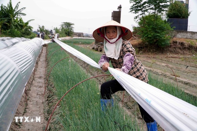 Người dân trồng màu ở xã Quỳnh Phụ, tỉnh Hưng Yên thay tấm nylon mới, che chắn cho rau màu chuẩn bị đến kỳ thu hoạch, ứng phó với bão sắp đổ bộ. (Ảnh: Nguyễn Công Hải/TTXVN)