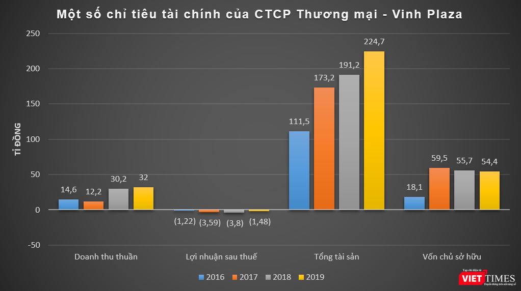 Dữ liệu của VietTimes cho thấy, trong giai đoạn 2016 - 2019, Vinh Plaza liên tục báo lỗ với lỗ sau thuế lũy kế 4 năm lên tới cả chục tỉ đồng. Cụ thể, năm 2016 và 2017, công ty này ghi nhận doanh thu thuần đạt lần lượt 14,6 tỉ đồng và 12,2 tỉ đồng, báo lỗ sau thuế lần lượt ở mức 1,22 tỉ đồng và 3,59 tỉ đồng.