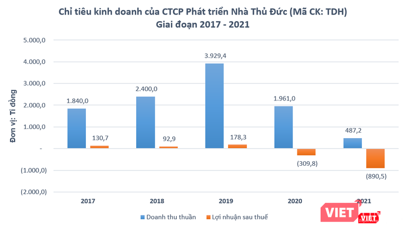 CTCP Phát triển Nhà Thủ Đức (Thuduc House – Mã CK: TDH) vừa công bố kết quả kinh doanh hợp nhất năm 2021 đã kiểm toán, với doanh thu thuần đạt 487,2 tỉ đồng, giữ nguyên so với báo cáo tự lập, giảm 75% so với thực hiện năm 2020. Trừ đi giá vốn hàng bán, công ty này báo lỗ gộp 66,4 tỉ đồng, trong khi năm trước có lãi 209,8 tỉ đồng.