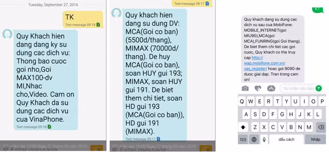 Mobifone còn khá khẩm hơn Vinaphone một chút, khi mạng này cũng có liệt kê cho khách hàng biết đang dùng những gói dịch vụ giá trị gia tăng gì và có thêm hướng dẫn khách hàng gọi điện thoại đến 9090 hoặc vào đường link đính kèm để biết thêm thông tin chi tiết về gói cước đang sử dụng. Tuy nhiên, Mobifone cũng “giấu” thông tin về giá trị gói cước cũng như cách hủy dịch vụ như Vinaphone.