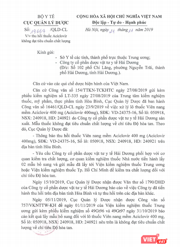 Trước đó, căn cứ công văn gửi kèm Phiếu kiểm nghiệm thuốc của Trung tâm kiểm nghiệm thuốc, mỹ phẩm, thực phẩm tỉnh Hòa Bình, ngày 23/9, Cục Quản lý Dược đã ban hành văn bản xử lý lô thuốc viên nang mềm Aciclovir 400mg, SĐK: VD-24375-16, Số lô: 050918, NSX: 24/9/2018, HD: 24/9/2021 do Công ty Cổ phần Dược vật tư y tế Hải Dương sản xuất.