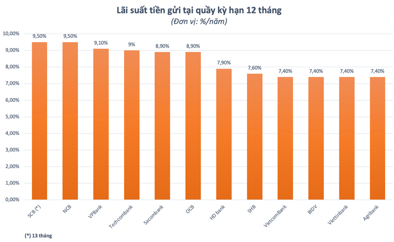 Cụ thể, SCB áp dụng mức lãi suất 9,5%/năm cho khoản tiền gửi kỳ hạn 13 tháng. Mức lãi suất này cũng được Ngân hàng Quốc dân (NCB) áp dụng cho kỳ hạn 1 năm.