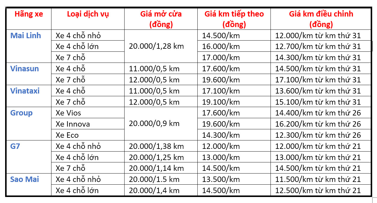 Nếu tính giá cước đi một quãng đường 5 km thì Taxi xanh SM có giá khoảng 82.000 đồng, giá xe 4 chỗ lớn của Mai Linh khoảng 80.000 đồng, giá của VinaSun khoảng 90.000 đồng, của taxi Group khoảng 89.000 đồng, của taxi G7 khoảng 70.000 đồng, của Vinataxi khoảng 88.000 đồng. Trong khi đó giá GrabCar cộng phụ phí thời gian là khoảng 68.000 đồng. BeCar có giá là 75.000 đồng.