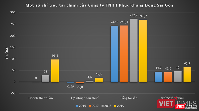 Dữ liệu của VietTimes cho thấy, các năm gần đây, các chỉ tiêu kinh doanh của Phúc Khang Đông Sài Gòn đang dần được cải thiện. Như năm 2019, doanh thu thuần và lợi nhuận sau thuế của công ty này đạt lần lượt 96,8 tỉ đồng và 17,5 tỉ đồng, cao gấp 3,4 lần và 3,8 lần so với năm 2018.