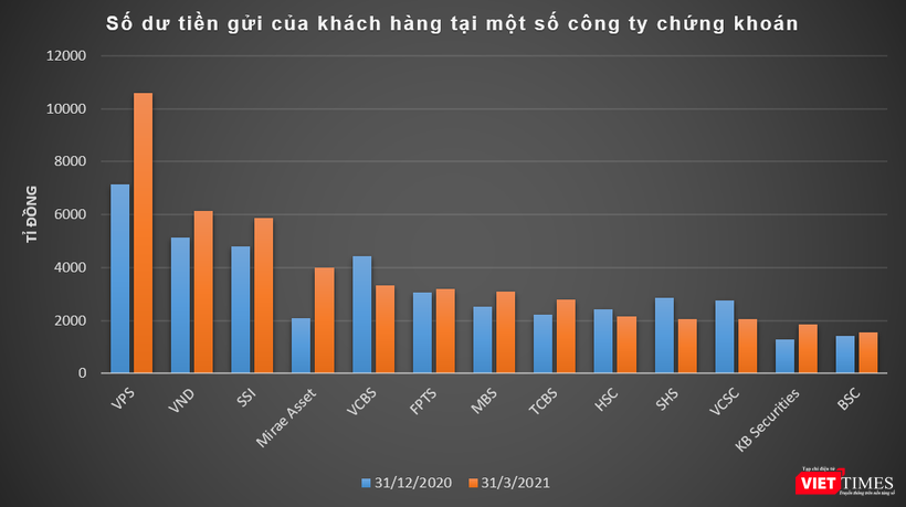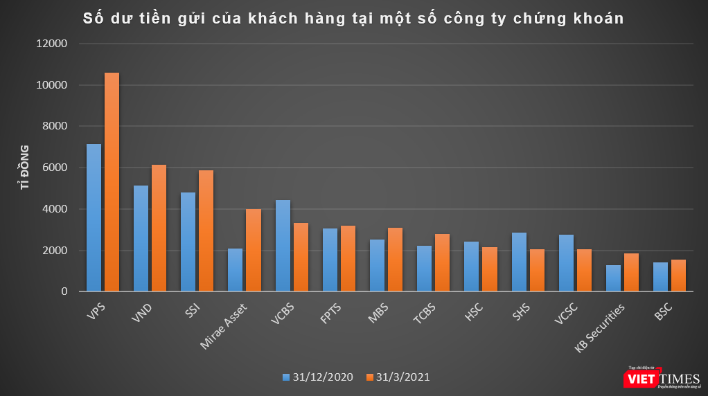 Tính đến cuối Quý 1/2021, số dư tiền gửi của khách hàng tại các công ty chứng khoán vào khoảng 65.000 tỉ đồng, tăng hơn 8% so với thời điểm đầu năm và đây là con số kỷ lục trong lịch sử. Trong đó chủ yếu là tiền gửi của nhà đầu tư giao dịch chứng khoán theo phương thức công ty chứng khoán quản lý. Đây là lượng tiền đang nằm sẵn trong tài khoản nhà đầu tư và chưa thực hiện giải ngân vào thời điểm 31/3/2021.