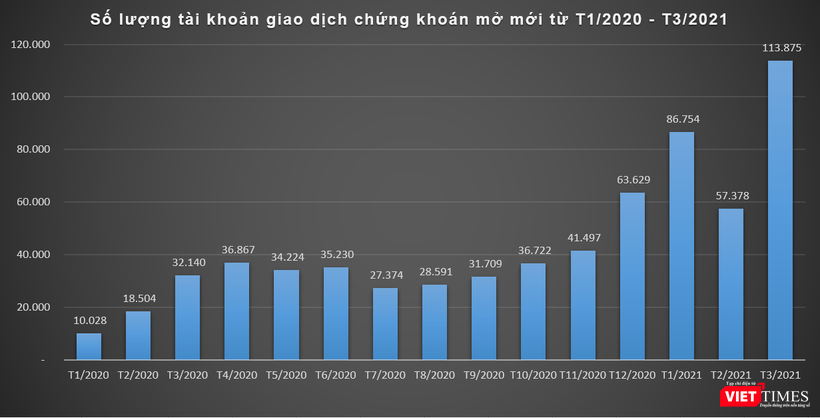 Theo số liệu thống kê của Trung tâm lưu ký chứng khoán (VSD), trong Quý 1/2021, có gần 257.000 tài khoản chứng khoán được nhà đầu tư trong nước mở mới, tương đương hơn 4.400 tài khoản được mở mới mỗi ngày (không bao gồm ngày nghỉ lễ, thứ 7 và chủ nhật).