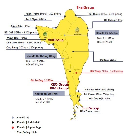Trong đó, rất nhiều dự án khu nghỉ dưỡng 5 sao được nhiều “ông lớn” rót hàng chục nghìn tỷ xây dựng trong năm qua. Đi tiên phong là tập đoàn Vingroup và Sungroup hiện đã hoàn thành và đang xây dựng nhiều cụm khu resort, sân golf, cáp treo…tầm cỡ quốc tế, với số vốn đầu tư mỗi đơn vị khoảng 10.000 tỷ. Tiếp đó là một số chủ dự án khác có tiềm lực như CEO Group và BIM Group cũng đang rót hàng nghìn tỷ ở Phú Quốc.