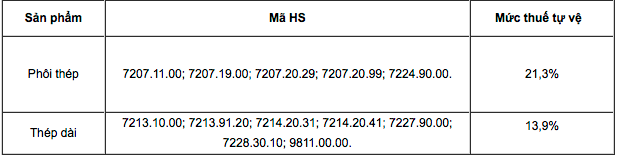 Các sản phẩm phôi thép và thép dài được loại trừ khỏi phạm vi áp dụng biện pháp tự vệ. Tại Mục 3, thông báo kèm theo Quyết định số 2968/QĐ-BCT nêu trên, mức thuế tự vệ đối với phôi thép là 23,3% và thép dài là 15,4% sẽ kết thúc vào ngày 21/3/2017.