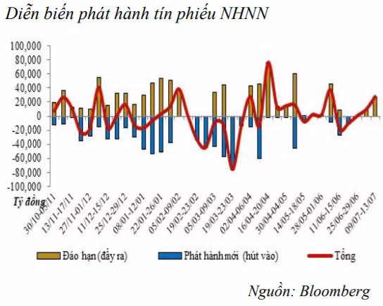 Dẫn nguồn thống kê của Bloomberg, BVSC cho biết, tuần vừa qua, Ngân hàng Nhà nước Việt Nam (NHNN) đã không phát hành tín phiếu mới, trong khi đó lượng vốn đáo hạn qua kênh này đạt 27.400 tỷ đồng.