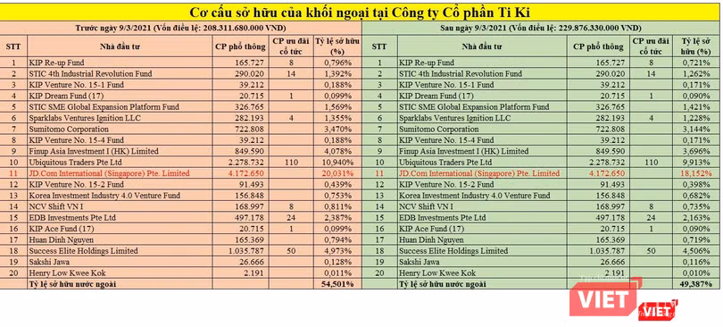 Các cổ đông nước ngoài dường như đã không tham gia vào đợt tăng vốn này, khiến tỉ lệ sở hữu của khối ngoại tại Tiki giảm xuống còn 49,387% vốn điều lệ.