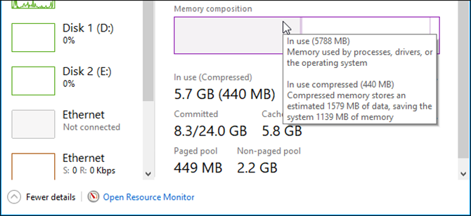 Bây giờ, nếu bạn rê chuột lên phần bên trái của thanh "Memory composition", bạn sẽ thấy thông tin chi tiết hơn về dữ liệu đã được nén. Như hình dưới, hệ thống đang sử dụng 5.7GB bộ nhớ RAM, 440MB trong số đó đã được nén mà khi giải nén ra tương đương với 1.5GB dữ liệu, tức là hệ thống đã tiết kiệm được 1.1GB bộ nhớ. Nếu không có tính năng nén bộ nhớ thì hệ thống sẽ phải dùng đến tận 6.8GB RAM thay vì chỉ 5.7GB RAM như hiện tại.