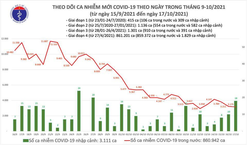 Tính từ 17h ngày 16/10 đến 17h ngày 17/10, trên Hệ thống Quốc gia quản lý ca bệnh COVID-19 ghi nhận 3.193 ca nhiễm mới, trong đó 18 ca nhập cảnh và 3.175 ca ghi nhận trong nước (giảm 36 ca so với ngày trước đó) tại 48 tỉnh, thành phố (có 1.339 ca trong cộng đồng).