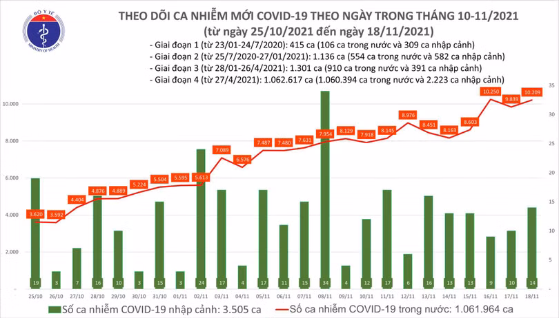 Tính từ 16h ngày 17/11 đến 16h ngày 18/11, trên Hệ thống Quốc gia quản lý ca bệnh COVID-19 ghi nhận 10.223 ca nhiễm mới, trong đó 14 ca nhập cảnh và 10.209 ca ghi nhận trong nước (tăng 370 ca so với ngày trước đó) tại 60 tỉnh, thành phố (có 5.454 ca trong cộng đồng).