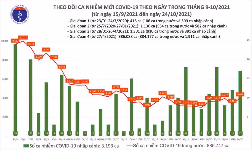 Tính từ 17h ngày 23/10 đến 17h ngày 24/10, trên Hệ thống Quốc gia quản lý ca bệnh COVID-19 ghi nhận 4.045 ca nhiễm mới, trong đó 17 ca nhập cảnh và 4.028 ca ghi nhận trong nước (tăng 667 ca so với ngày trước đó) tại 47 tỉnh, thành phố (có 1.599 ca trong cộng đồng).