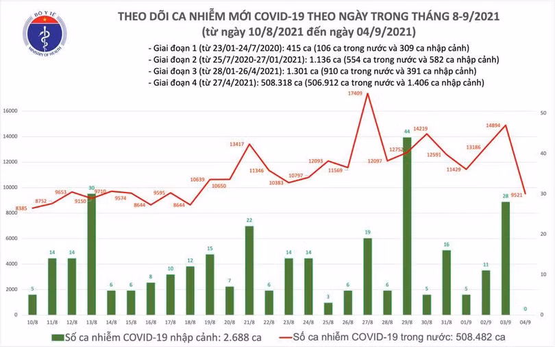 Cụ thể, 9.521 ca nhiễm mới gồm tại TP. Hồ Chí Minh (4.104), Bình Dương (2.485), Đồng Nai (992), Long An (544), Tiền Giang (148), Tây Ninh (137), Kiên Giang (125), Đồng Tháp (120), Quảng Bình (110), Bình Thuận (99), Cần Thơ (76), Đắk Lắk (73), Bình Phước (62), Hà Nội (52), Khánh Hòa (51), Đà Nẵng (47), Bà Rịa - Vũng Tàu (39), An Giang (35), Nghệ An (32), Phú Yên (29), Quảng Ngãi (23), Thừa Thiên Huế (22), Sóc Trăng (21), Bạc Liêu (15), Trà Vinh (14), Gia Lai (12), Sơn La (9), Thanh Hóa (8 ), Bình Định (7), Vĩnh Long (7), Cà Mau (6), Lâm Đồng (5), Ninh Thuận (3), Bắc Ninh (3), Bến Tre (2), Hà Tĩnh (1), Thái Bình (1), Lạng Sơn (1), Đắk Nông (1) trong đó có 4.734 ca trong cộng đồng.
