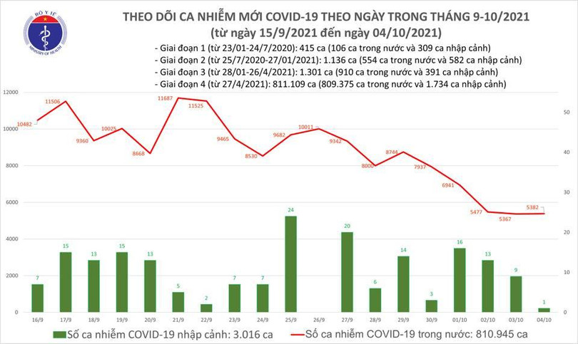 Tính từ 17h ngày 03/10 đến 17h ngày 04/10, trên Hệ thống Quốc gia quản lý ca bệnh COVID-19 ghi nhận 5.383 ca nhiễm mới, trong đó 01 ca nhập cảnh và 5.382 ca ghi nhận trong nước (tăng 15 ca so với ngày trước đó) tại 37 tỉnh, thành phố (có 2.690 ca trong cộng đồng).
