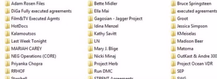Trong đó, có các thư mục mang tên khách hàng là người nổi tiếng như Lady Gaga, Nicki Minaj, Bruce Springsteen, Mary J. Blige, Ella Mai, Christina Aguilera, Mariah Carey, Cam Newton, Bette Midler, Jessica Simpson…