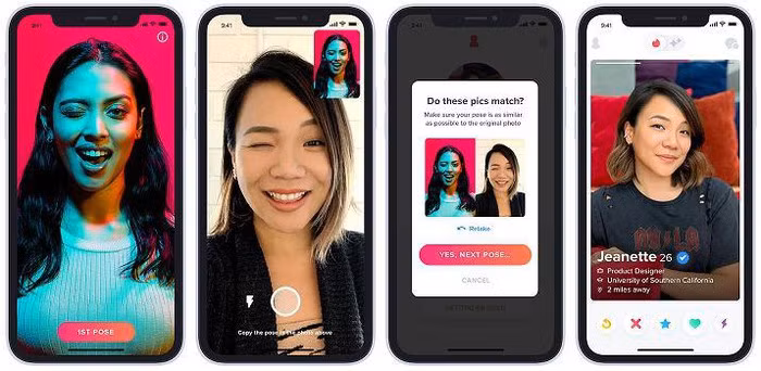 Tính năng Xác minh qua ảnh của Tinder giúp đảm bảo tính xác thực của đối tượng tương hợp, cho phép các thành viên tự xác thực tài khoản của mình bằng một loạt ảnh chụp khuôn mặt ngay tại thời điểm thực tại và so sánh với ảnh đại diện bằng công nghê AI. Các hồ sơ đã được xác thực sẽ có dấu tích xanh bên cạnh.