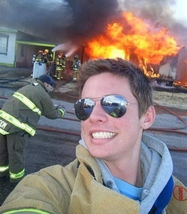 Sau kia có đám cháy kìa, lại đây chụp ảnh up lên Facebook nào.