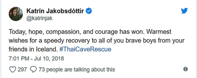 Thủ tướng Iceland, bà Katrin Jakobsdolttir là nhà lãnh đạo đầu tiên trên thế giới gửi lời chúc mừng đến Thái Lan. Bà chắc chắn không phải là người cuối cùng.