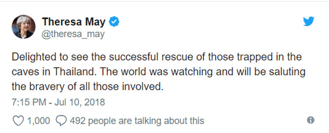 Hải quân Thái Lan viết trên Facebook rằng tất cả đã an toàn và chúng ta chờ nốt 4 "con ếch" ra khỏi hang. Con ếch ám chỉ 4 thành viên trong đội cứu hộ, bao gồm 1 bác sỹ và 3 thợ lặn đã túc trực cạnh các cậu bé trong 3 ngày qua.
