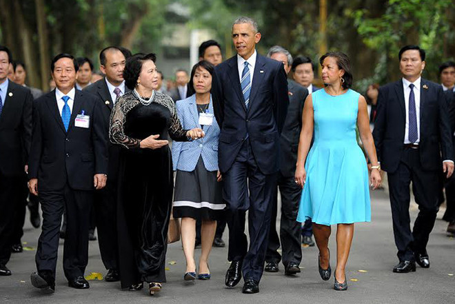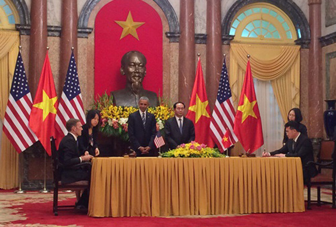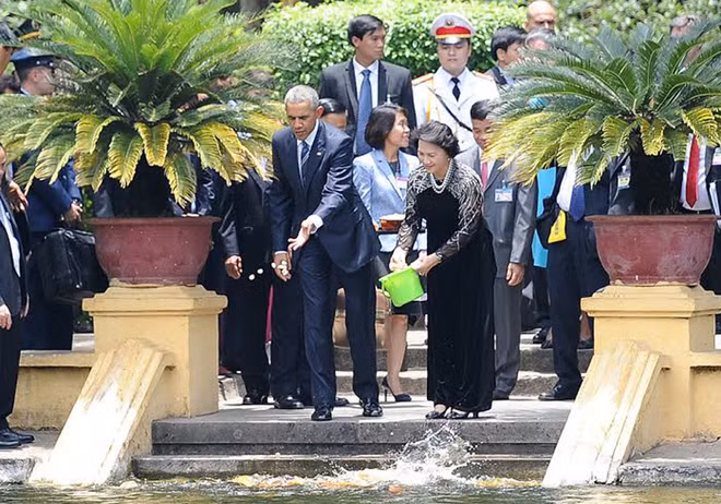 Sau lễ ký kết, Tổng thống Obama tiếp xúc với Chủ tịch Quốc hội Nguyễn Thị Kim Ngân tại Nhà sàn Hồ Chủ tịch.